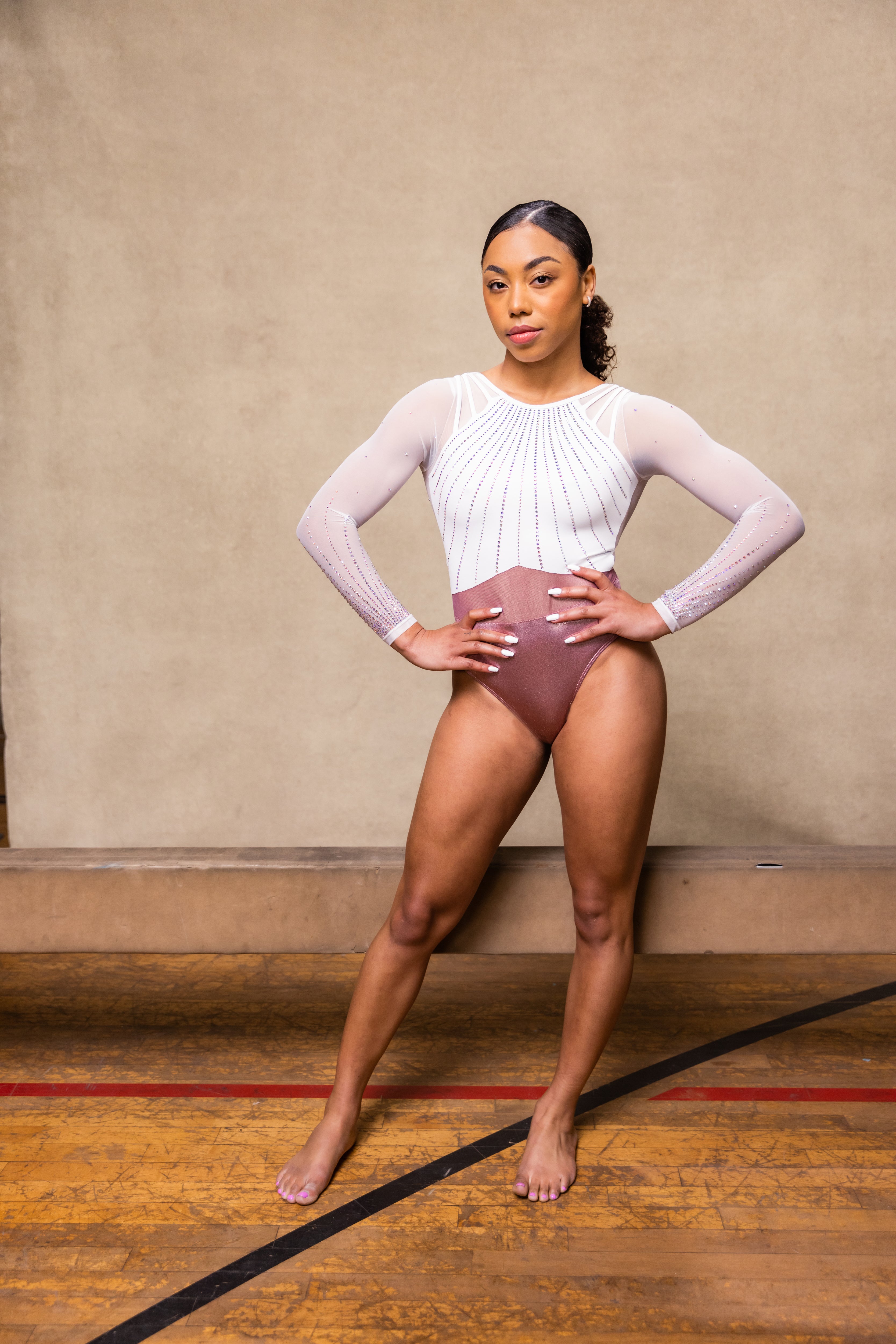 A style statement – The Lenora design is a masterpiece, cleverly combining metallic fabrics in a rose gold coloring with wine colored hues. Crafted in our signature round neckline shape with the addition of delicate straps that interconnect the front to the back. The belt panel is in a mesh with skin lining for complete coverage. Lower body is made from a mystique fabrication. The crystals have been engineered to cascade from neckline through the front chest with a light scatter through the sleeves.