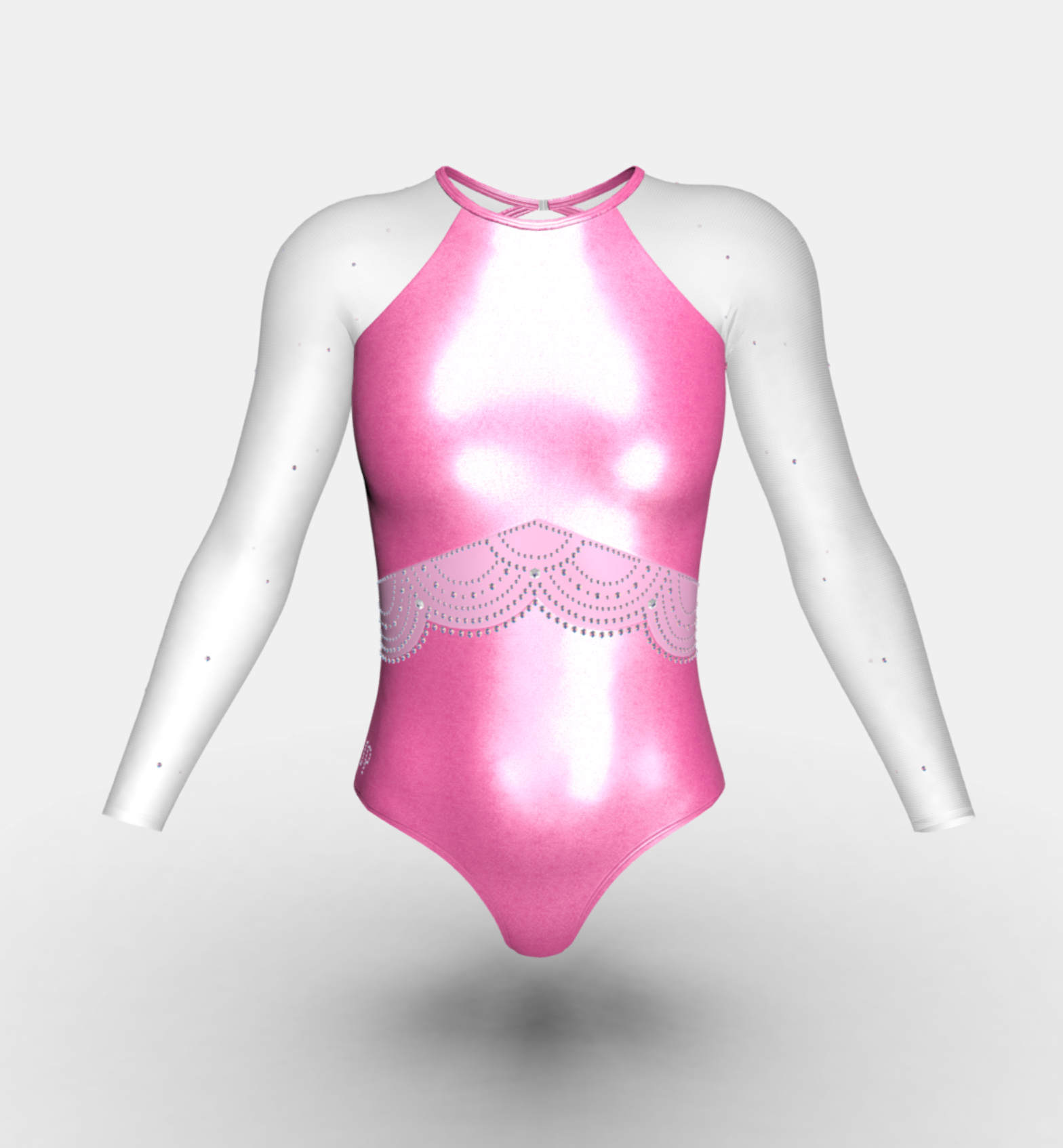Inspired by some of Maggie Nichols most favorite competition leotards of all time – she wanted to show the world how your confidence can shine from the inside out. Crafted in a round neckline shape with back neck clasp and keyhole for ease of movement. The real unique feature of this design is the scalloped mesh belt that is skin lined for complete coverage. Front bodice has been made from a metallic rose gold mystique fabrication whilst the lower is made from a matt lycra to give the wearer a contrast between shine and matt. The crystals shimmer up and out from the belt, with a beautifully engineered scalloped crystal belt.