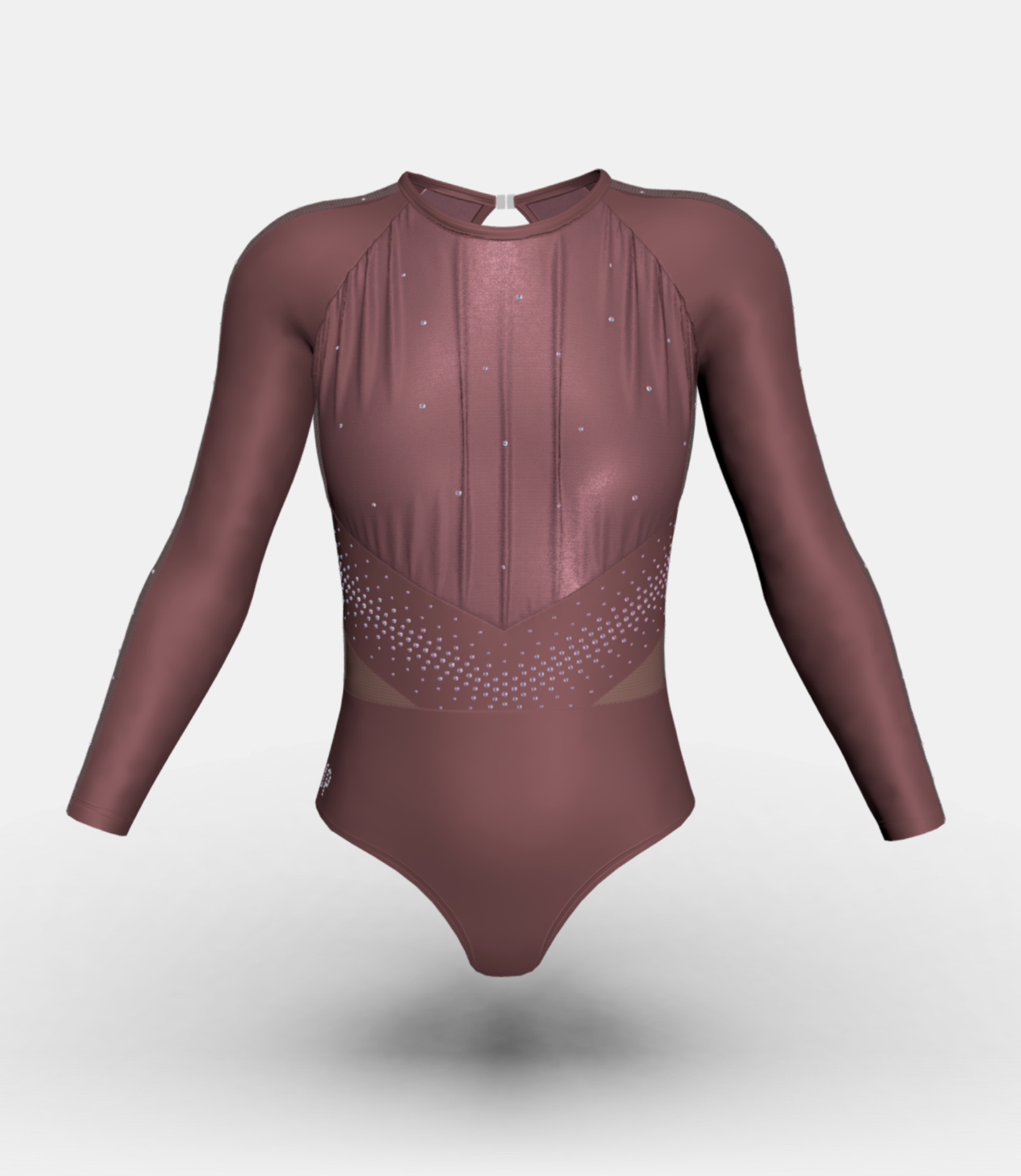 A revolutionary design that oozes sophistication. The Willow leo cleverly combines a double layer mesh gather with a subtle sheen shining out from underneath. The sleeves have been modelled in a raglan sleeve shape with expertly placed panels. The lower body and belt panels are crafted from a matt lycra fabrication, whilst the mesh cutouts are skin lined to ensure complete coverage. The crystals have been engineered as a front crystal belt with a light scatter on the sleeves on chest.