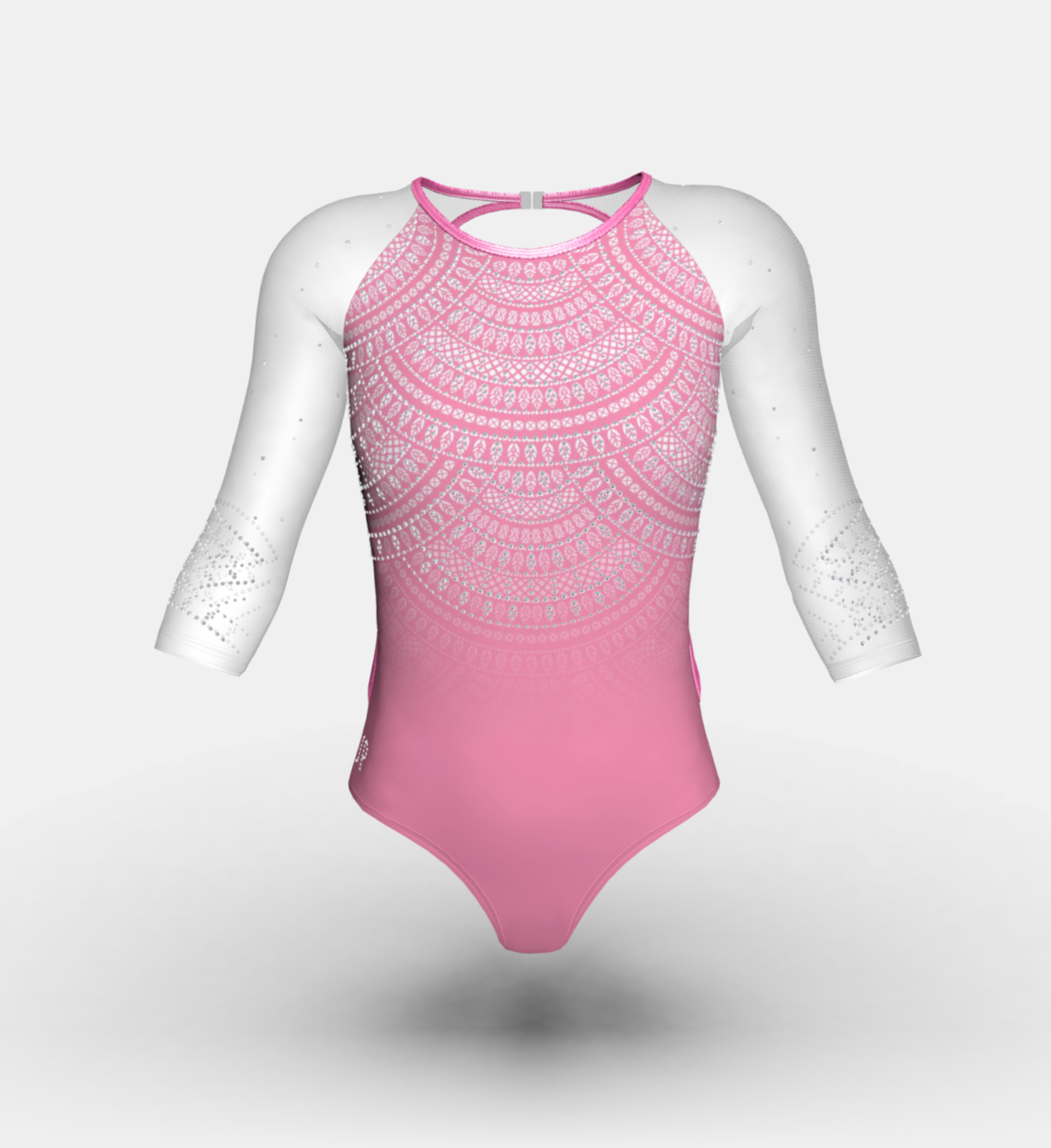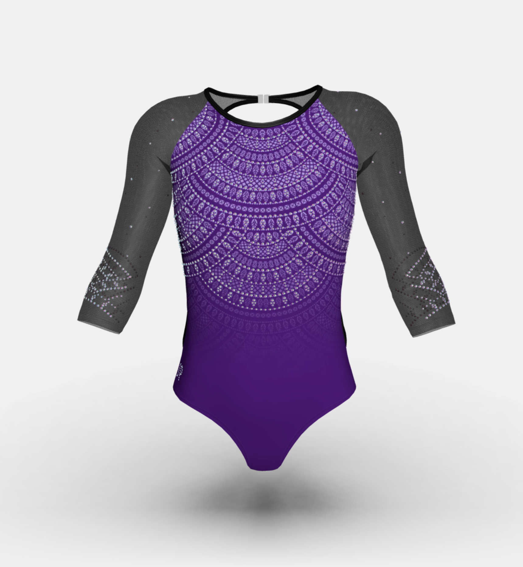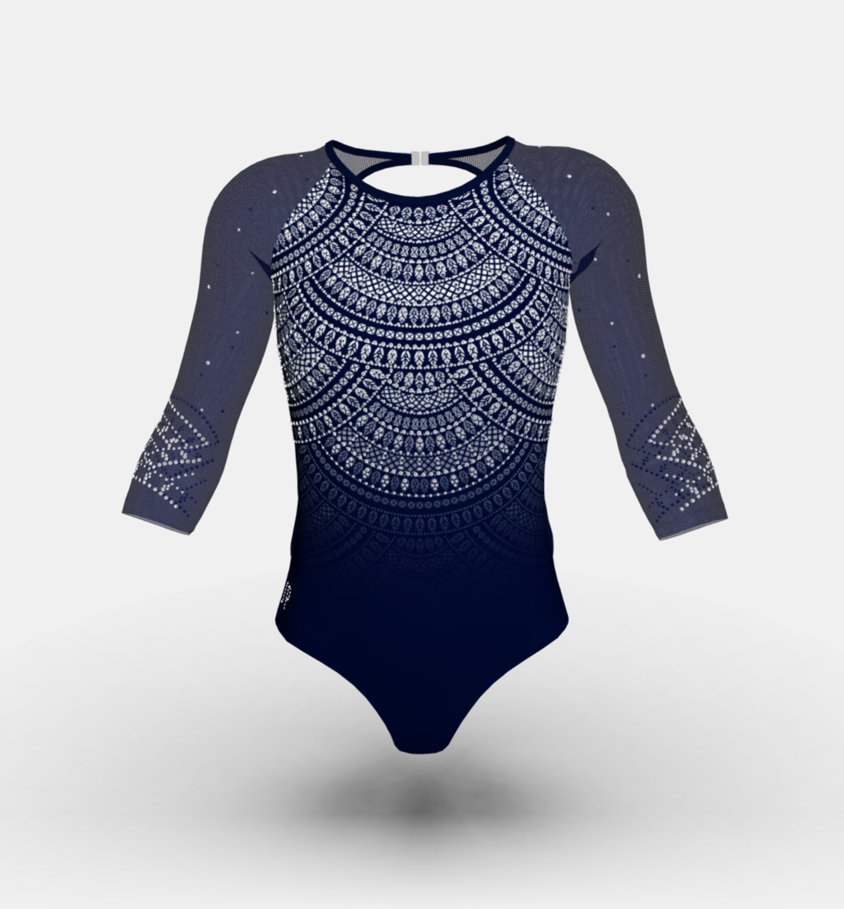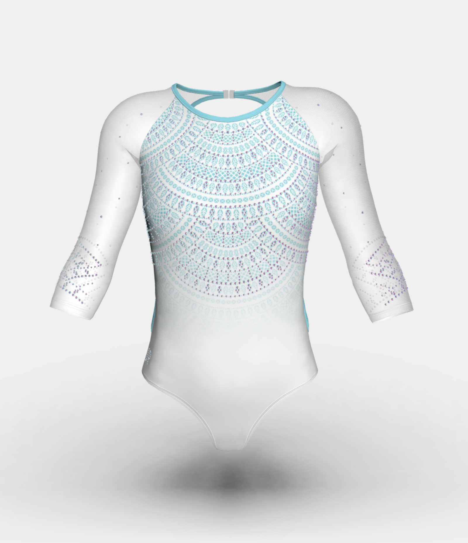 Shine like a diamond in the Aria design. Crafted in a round neckline shape with added clasp and keyhole at the back for ease. The body features a sublimated design with intricate pattern and ombre styling. Sleeves are constructed from mesh with a matching crystal design to the body pattern on the sleeve cuff. Additional straps at the back are overlaid onto the main body to ensure full coverage. Crystals cascade through the front bodice through the design.