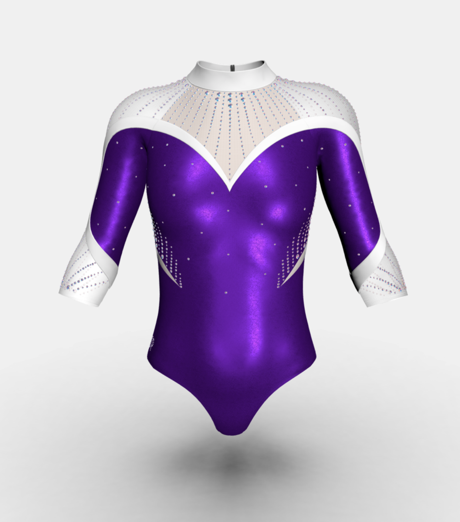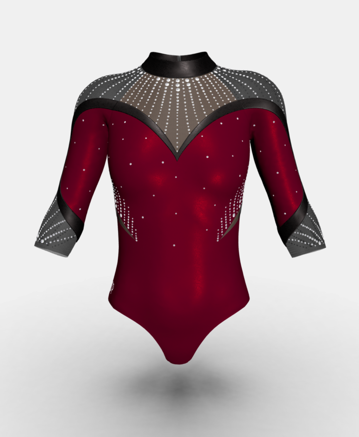 A next-generation aesthetic fused with grandeur—introducing the Harlie design. Styled in a high neckline with a collar, clasp & keyhole at the back for ease of movement. This leotard is designed with a metallic mystique embellishment feature & a sweetheart panel line. Waist accentuating panels are cut in mesh. The metallic mystique embellishment sweeps down the sleeves to create a unique shape. Magnificent crystals cascade down from the neckline in a 1920’s inspired design & spray up the body & sleeves. Cut from our matt lycra fabrication that has great stretch & durability with mystique embellishment & mesh sleeves. The front of this leotard is fully lined for complete athlete comfort with all mesh body panels fully lined with skin lining for zero transparency.
