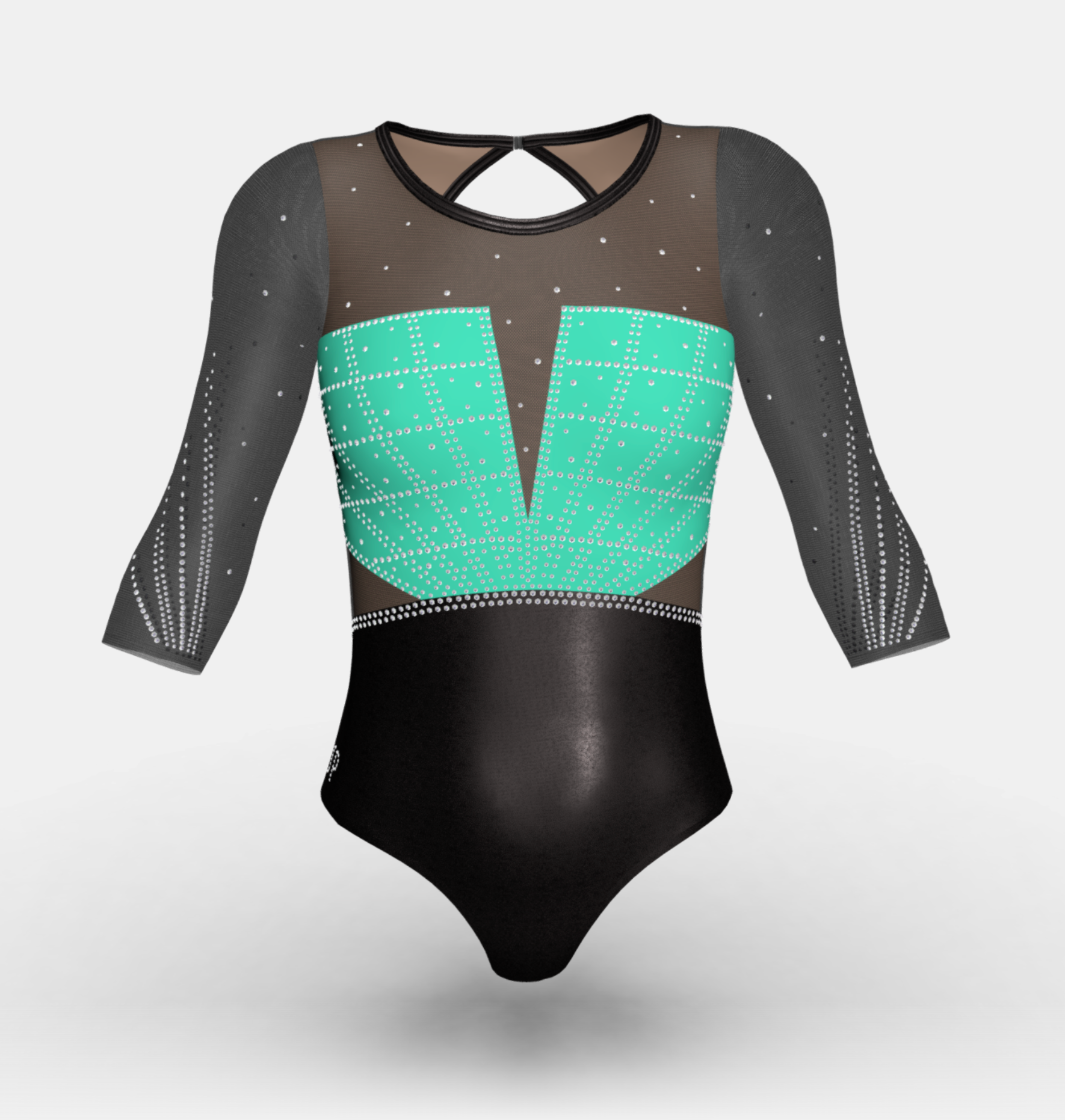 Named after one of our most experienced sewers on the production team—the Kerri design exudes high-fashion elegance on the gymnastics floor. Styled in a higher round neckline with clasp at the back, a deep V-shaped sweetheart adorns the front with side mesh cutouts.