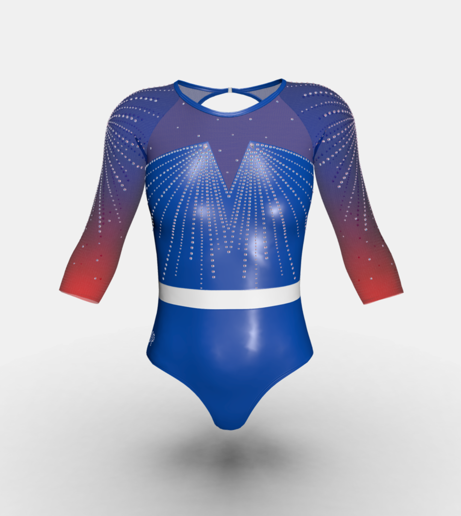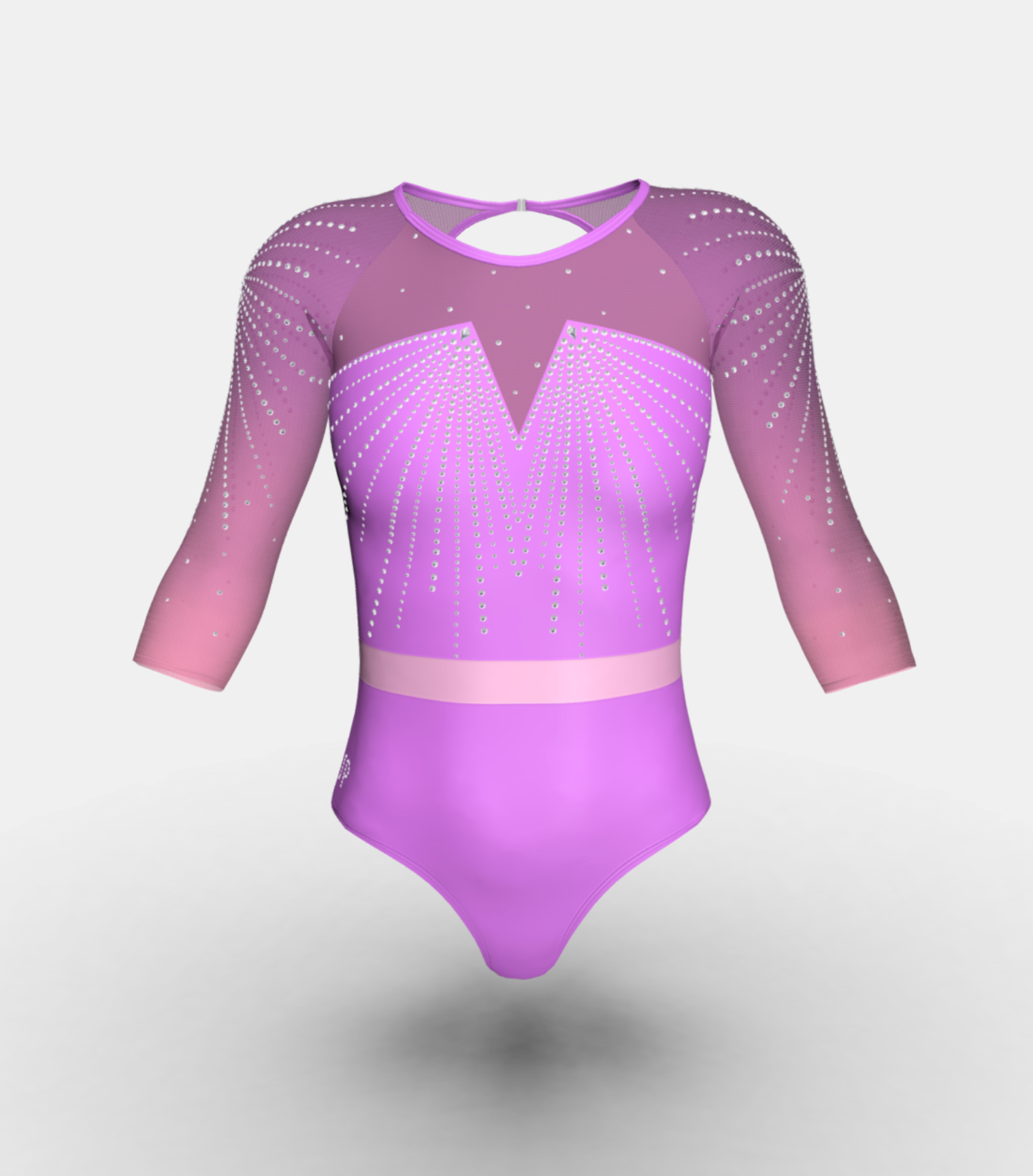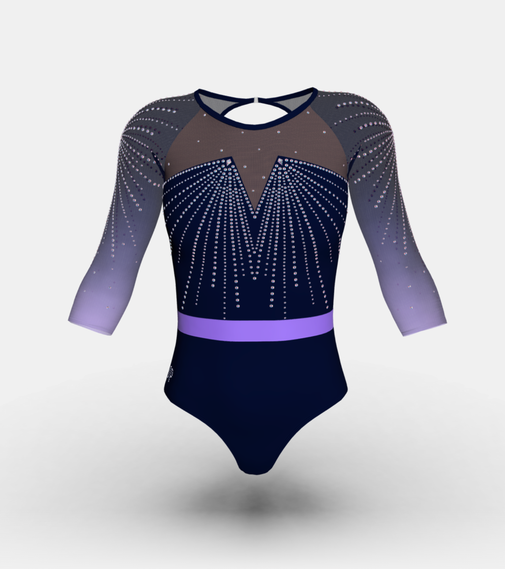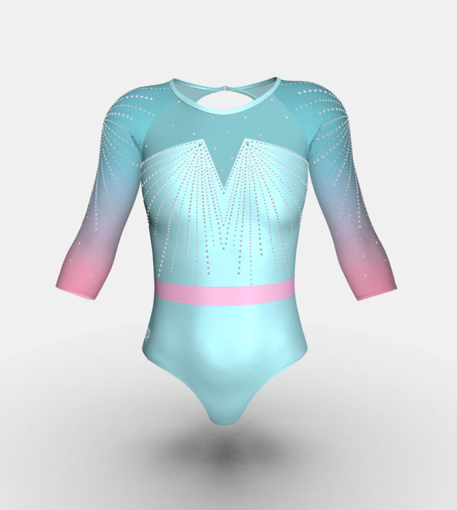 Kyla wanted to emulate a celebratory feeling, modern sharp design lines and a fierceness in her collaboration leotard. Styled in a round neckline shape with front sweetheart paneling that is sharp with a contrast color belt detail. The back features a clasp and keyhole for ease with the addition of a mesh panel that is skin lined plus contrast color design lines that flatter and create shape through the back. The crystals adorn the front bodice and upper sleeves in a heavy firework explosion to ensure maximum sparkle and luster on the competition floor. The main body is crafted from a wetlook fabrication that is available in select colors with matt lycra contrast and mesh sleeves that have an ombre print.