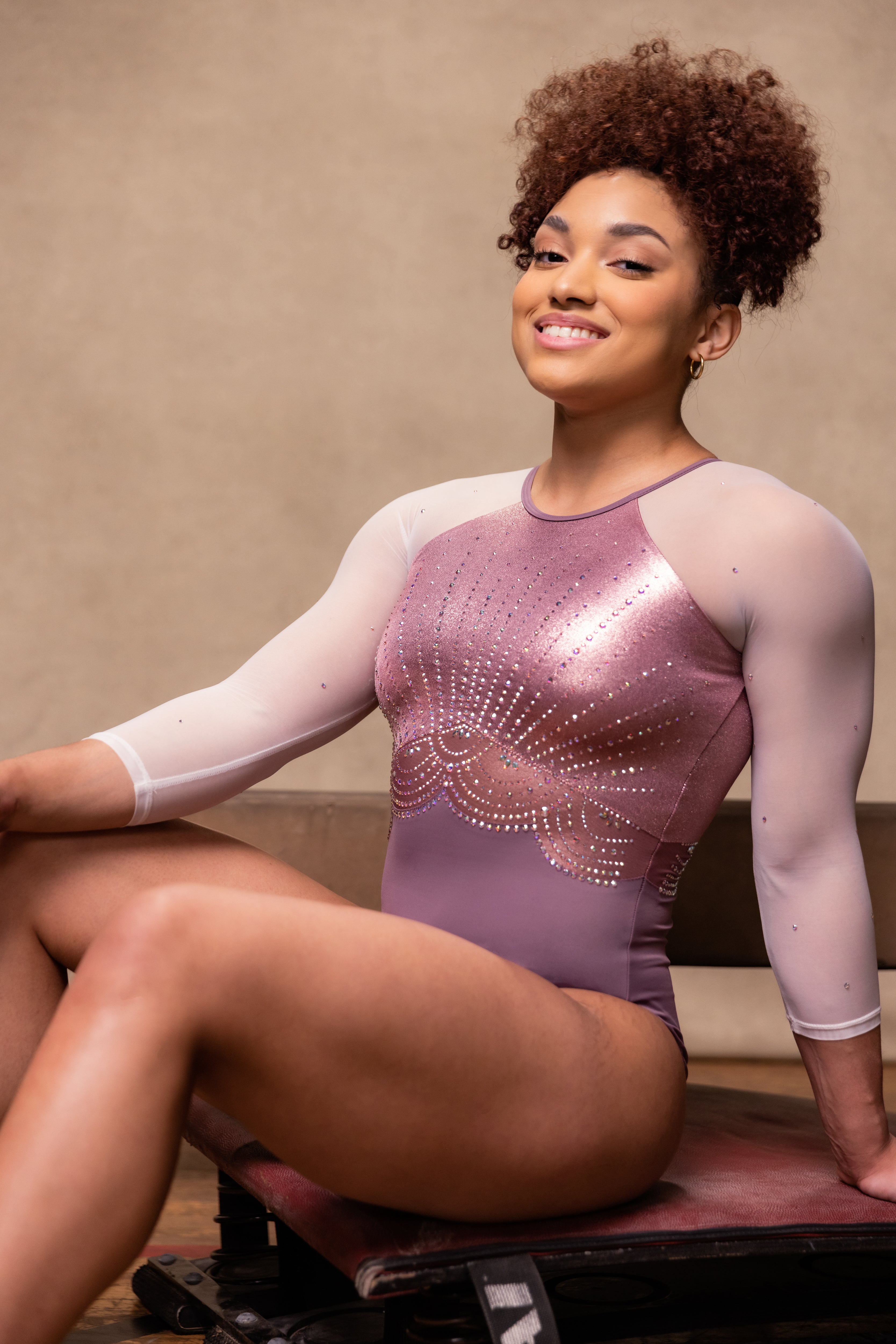 Inspired by some of Maggie Nichols most favorite competition leotards of all time – she wanted to show the world how your confidence can shine from the inside out. Crafted in a round neckline shape with back neck clasp and keyhole for ease of movement.
