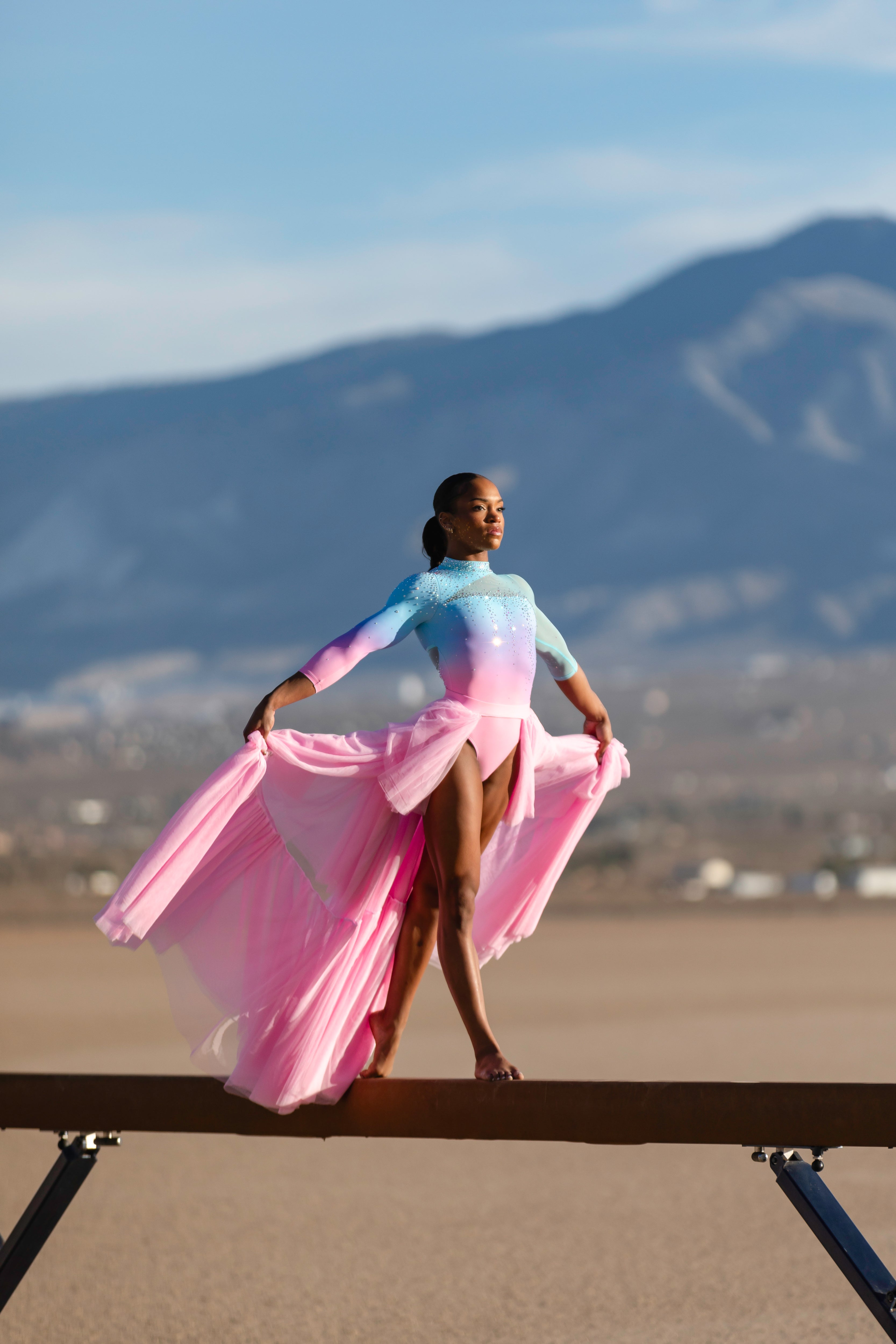 High fashion and editorial—the Shi leotard was inspired by Shilese Jones’s 2023 Championships look of the same design. Styled in a high neck with a neckband and clasp at the back, the asymmetric design flows with the body.