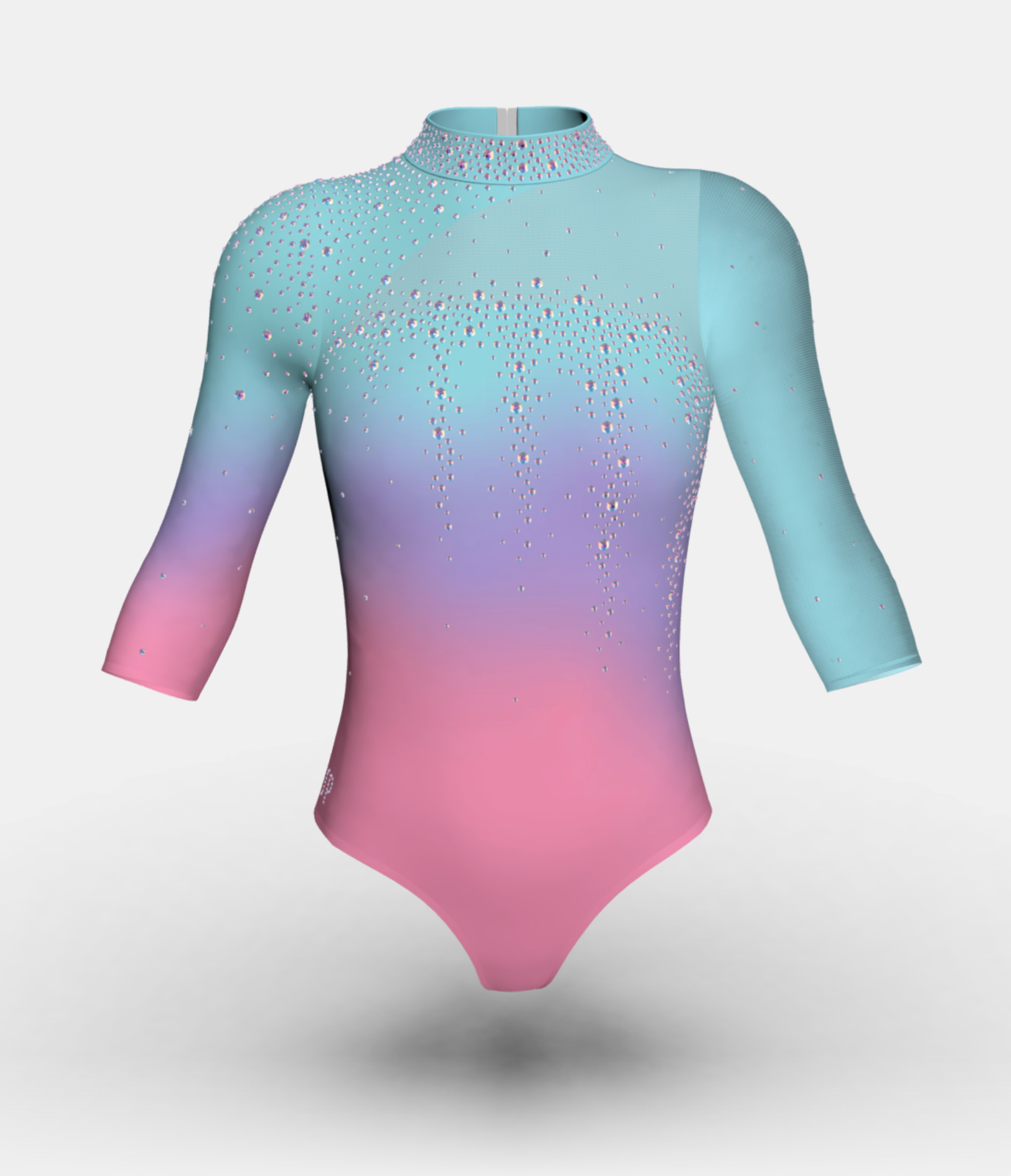 High fashion and editorial—the Shi leotard was inspired by Shilese Jones’s 2023 Championships look of the same design. Styled in a high neck with a neckband and clasp at the back, the asymmetric design flows with the body. Angled mesh panelling combines with a curved keyhole back and a one-shoulder design. Sleeves are cut from textural fabrications, one matt lycra and one mesh. The all-over freeform ombre is eye-catching and femme. The AB-coloured stones are the showstopping hero, with heavy scattering through the neck and shoulder, expanding to delicate icicles through the bodice. Embellished with crystals by Swarovski®.