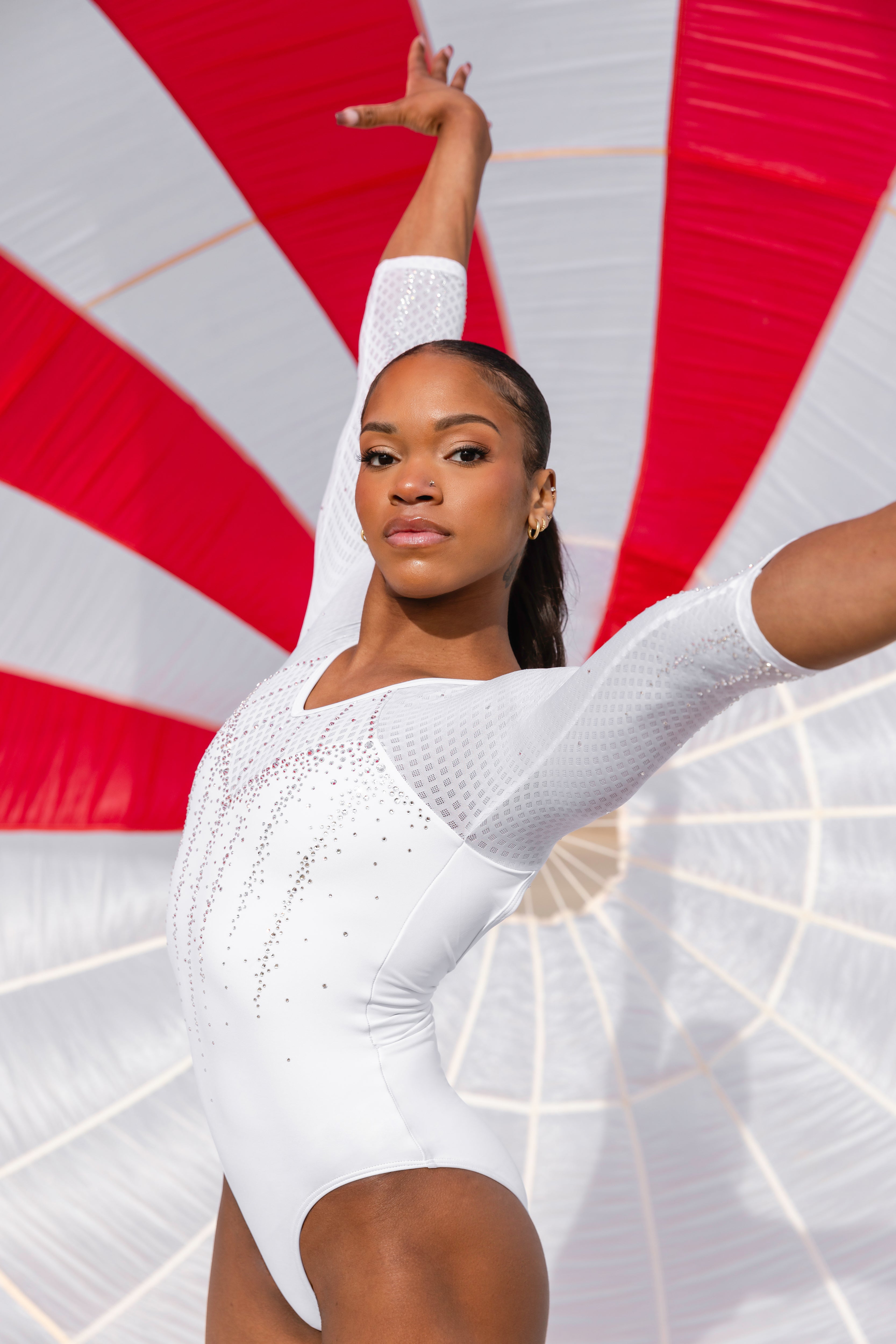 Inspired by Shilese Jones 2023 Championship’s leotard—the Pia design oozes style, elegance, and refinement. Styled in a classic couture shape with a twist, a V-neckline cuts through the front and back with a dance-inspired gathering detail at the back waistline. This design plays on textures, introducing our Diamond Mesh on the sleeves and mesh panels. It is a super soft and lightweight fabric with great stretch. Clear crystals are the hero piece, creating fascinating icicles of stones drifting down the body and sleeves, scattering on the back. Embellished with crystals by Swarovski®.