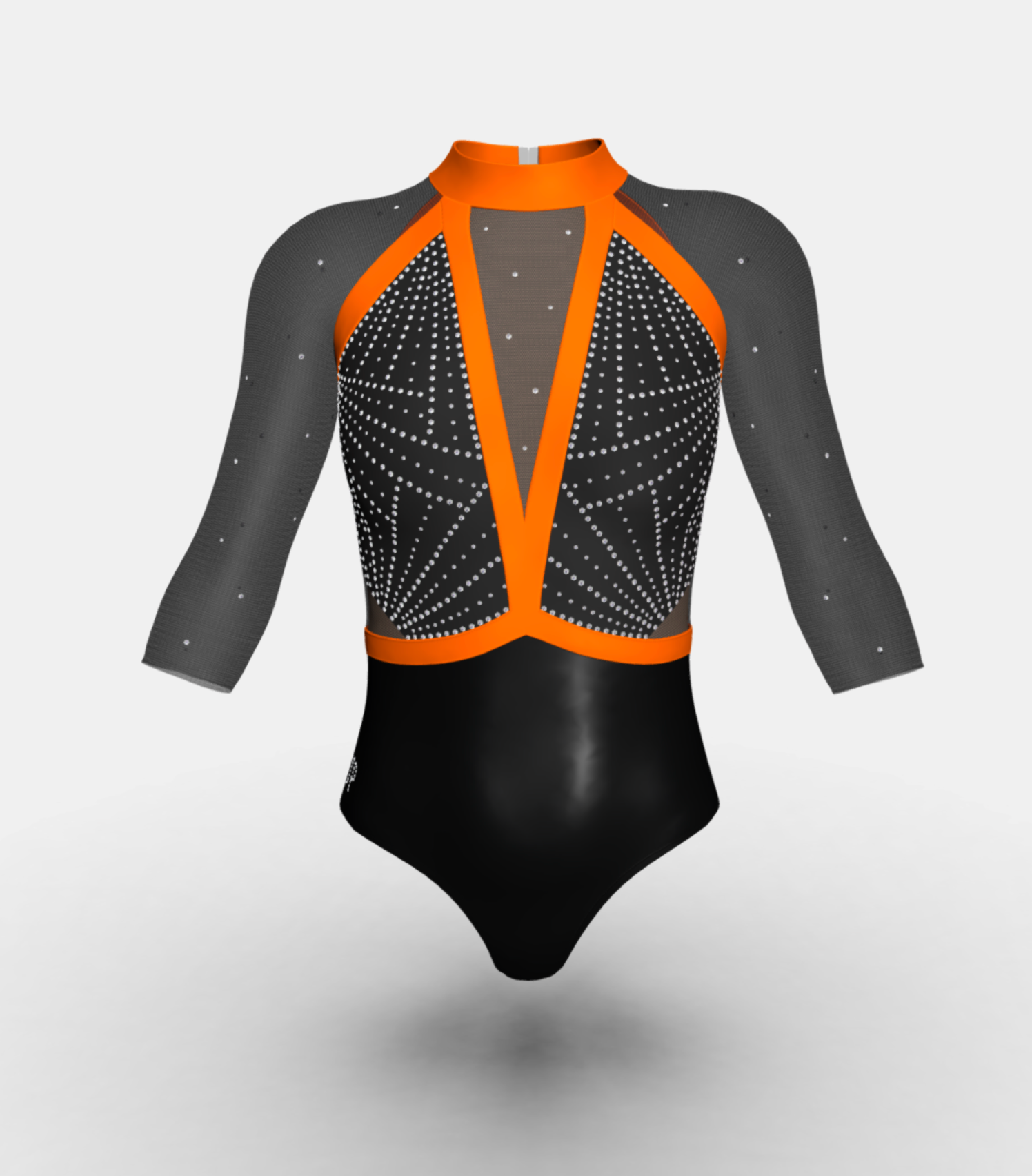 The Nora design combines spectacular craftsmanship with main character energy to amp up the competition floor. The high neckline with contrast colour collar & panelling creates a dramatic, yet modern design aesthetic. The waistline is accentuated with angular mesh panels & dynamic detailing. The back features a clasp & keyhole for ease of movement with the addition of mesh panels & contrast colour straps. The crystals create a style statement as they have been crafted to spray like fireworks through the upper bodice front & back. Cut from a combination of our matt lycra through the upper bodice, sumptuous wetlook fabrication through the lower, & finished with mesh sleeves & body panels. The front of this leotard is fully lined for complete athlete comfort with all mesh body panels fully lined with skin lining for zero transparency.